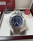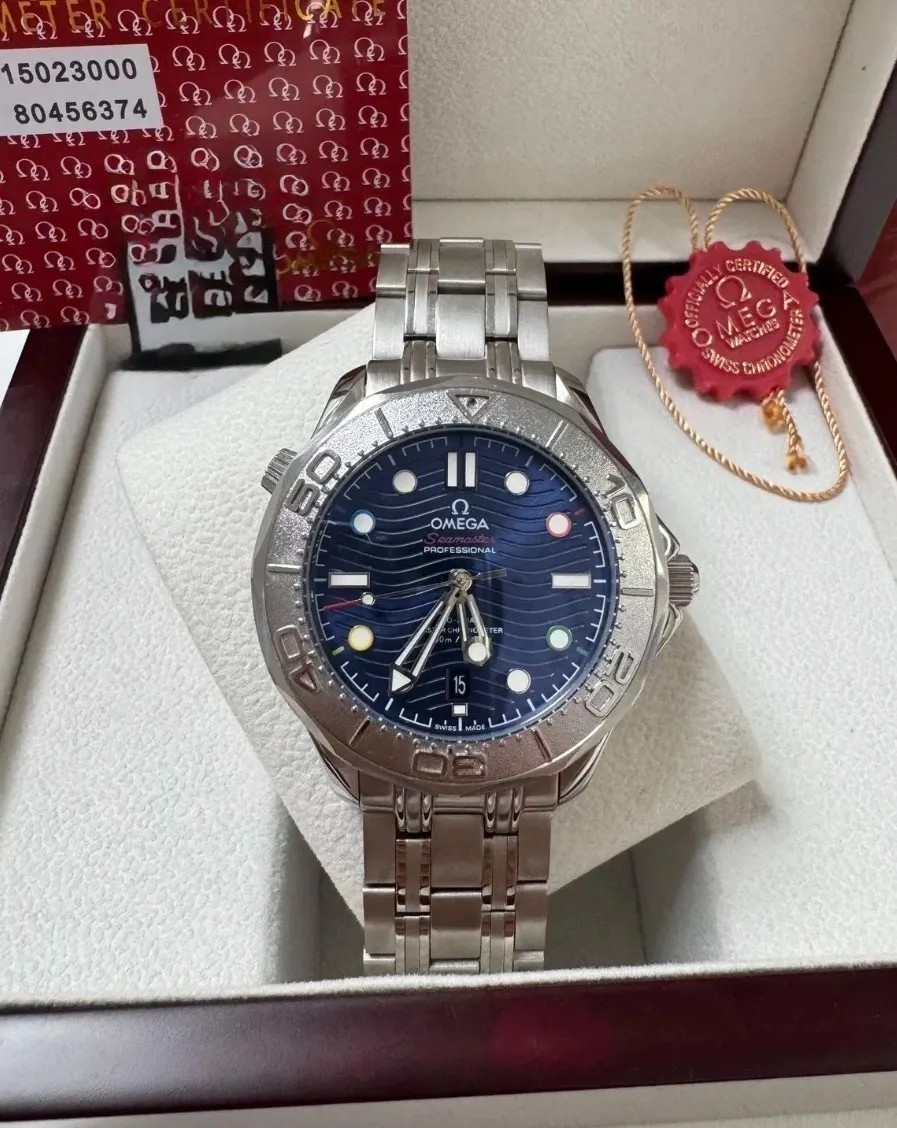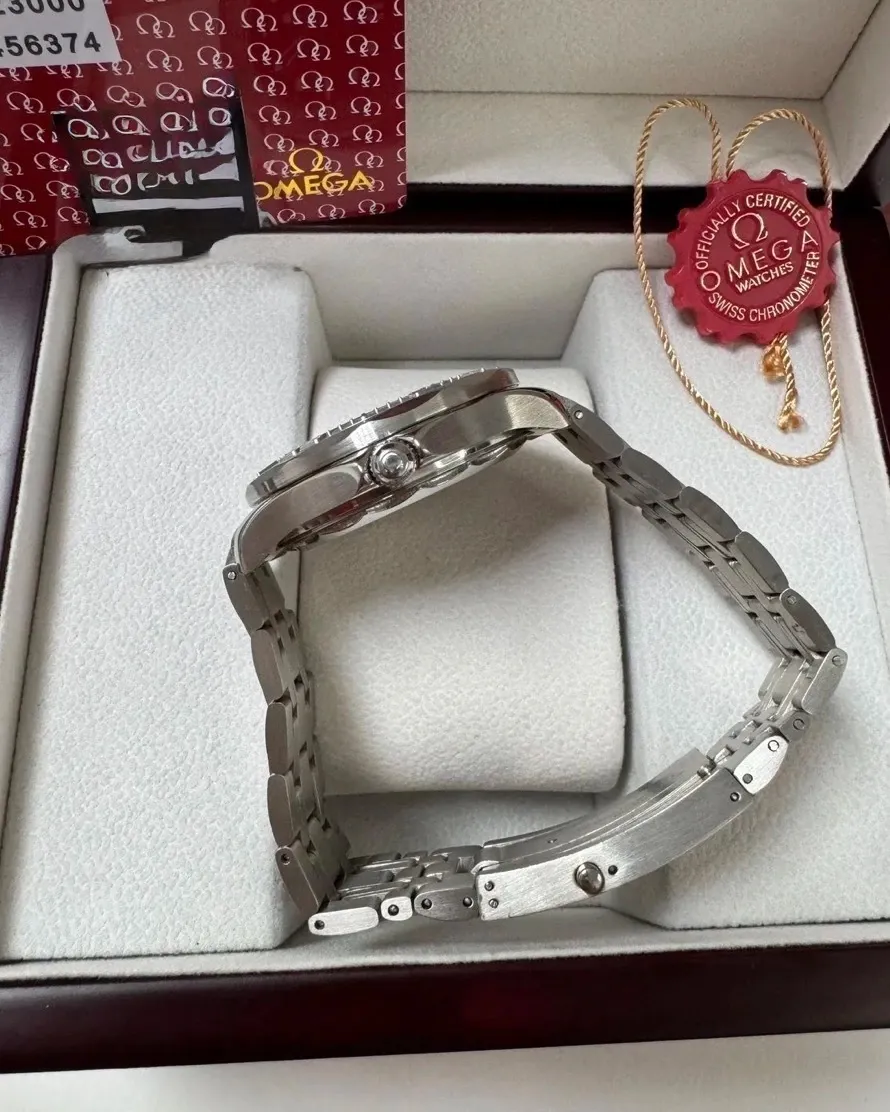Com 42 mm de diâmetro, o design robusto e sofisticado é realçado pelo vidro em safira, resistente a riscos, e pela caixa em aço inoxidável denso, que garante durabilidade e um acabamento elegante. Além disso, o Omega Seamaster é à prova d’água até 20 ATM, ideal para atividades aquáticas e uso diário sem preocupações.