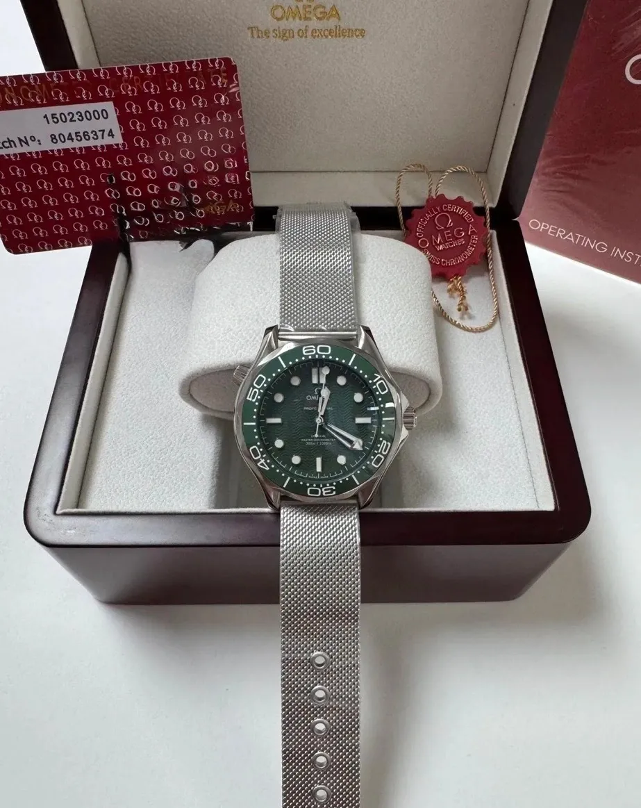 Com 42 mm de diâmetro, o design robusto e sofisticado é realçado pelo vidro em safira, resistente a riscos, e pela caixa em aço inoxidável denso, que garante durabilidade e um acabamento elegante. Além disso, o Omega Seamaster é à prova d’água até 20 ATM, ideal para atividades aquáticas e uso diário sem preocupações.