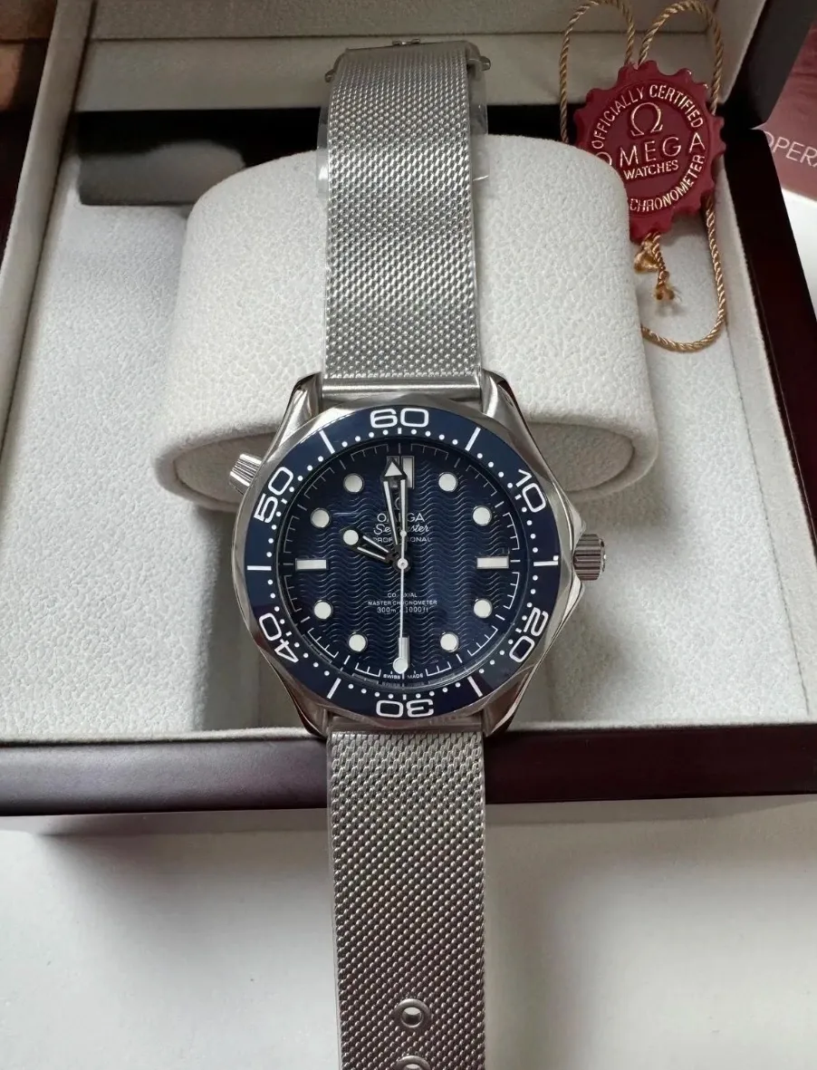 Com 42 mm de diâmetro, o design robusto e sofisticado é realçado pelo vidro em safira, resistente a riscos, e pela caixa em aço inoxidável denso, que garante durabilidade e um acabamento elegante. Além disso, o Omega Seamaster é à prova d’água até 20 ATM, ideal para atividades aquáticas e uso diário sem preocupações.