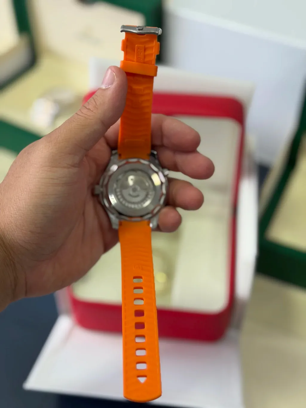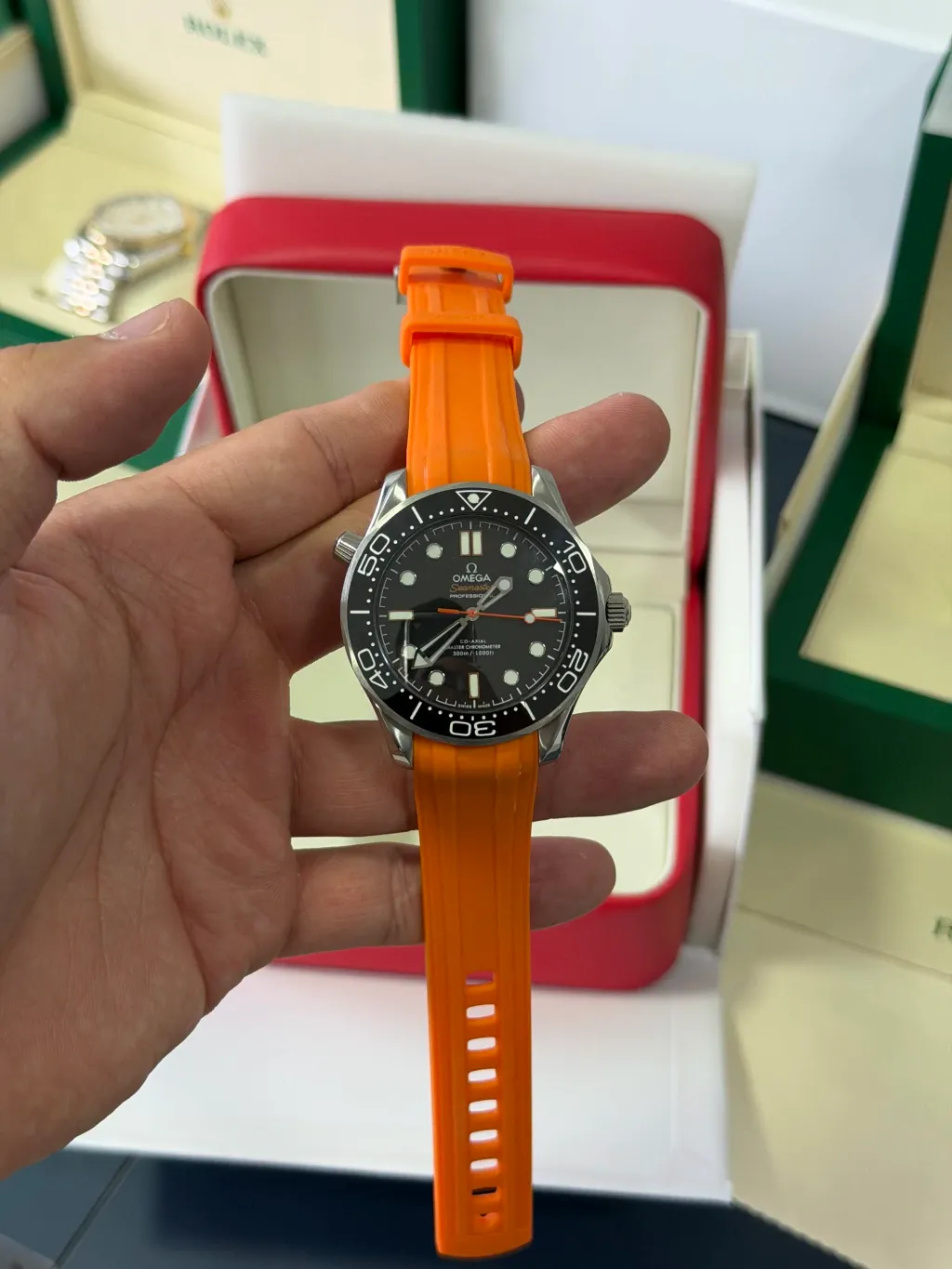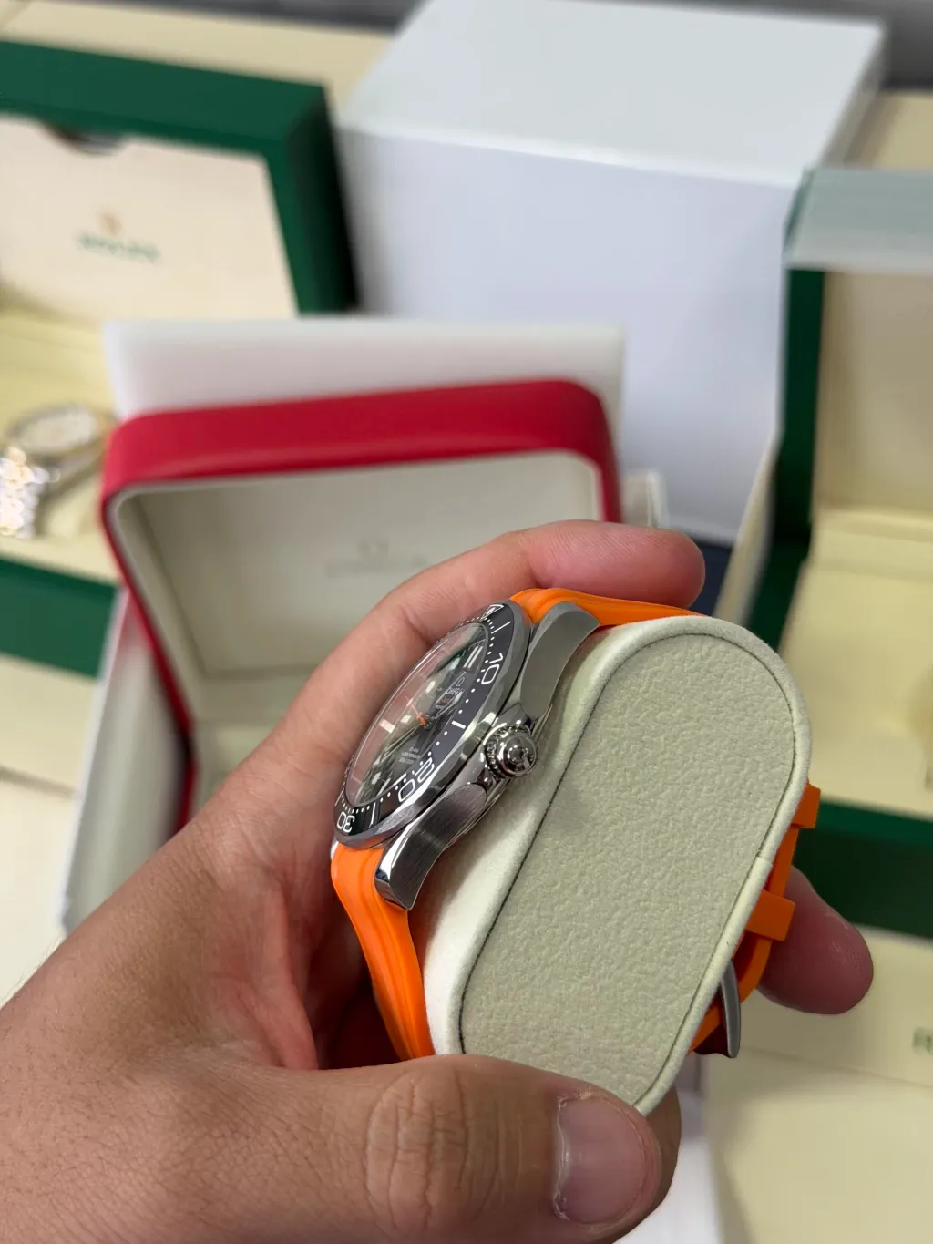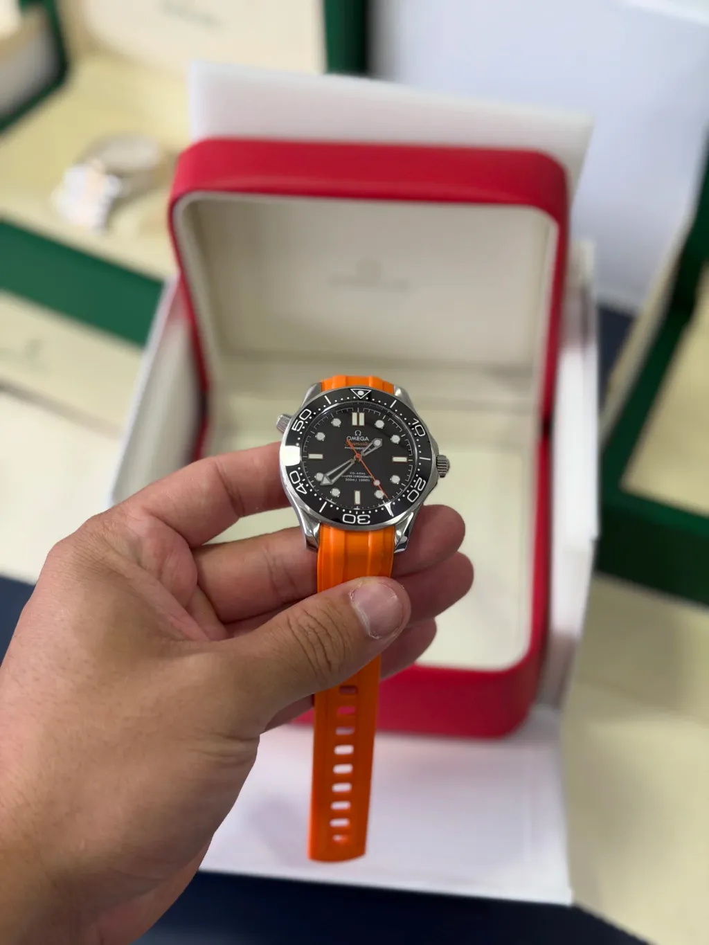 Com 43 mm de diâmetro, o design robusto e sofisticado é realçado pelo vidro em safira, resistente a riscos, e pela caixa em aço inoxidável denso, que garante durabilidade e um acabamento elegante. Além disso, o Omega Seamaster é à prova d’água até 20 ATM, ideal para atividades aquáticas e uso diário sem preocupações.
