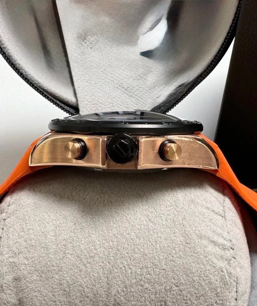Com um diâmetro imponente de 43 mm, o relógio possui vidro em safira, altamente resistente a riscos, e corpo em aço inoxidável denso, garantindo durabilidade e acabamento sofisticado. A pulseira em silicone proporciona conforto e modernidade.