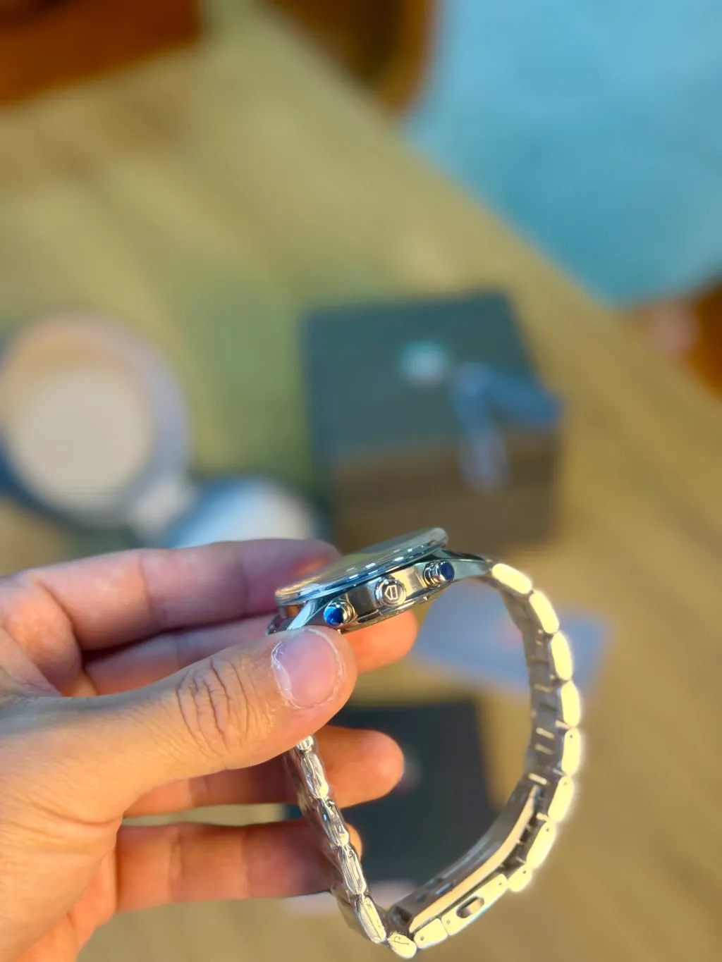 Com um diâmetro imponente de 41 mm, o relógio possui vidro em safira, altamente resistente a riscos, e corpo em aço inoxidável denso, garantindo durabilidade e acabamento sofisticado. A pulseira em silicone proporciona conforto e modernidade.