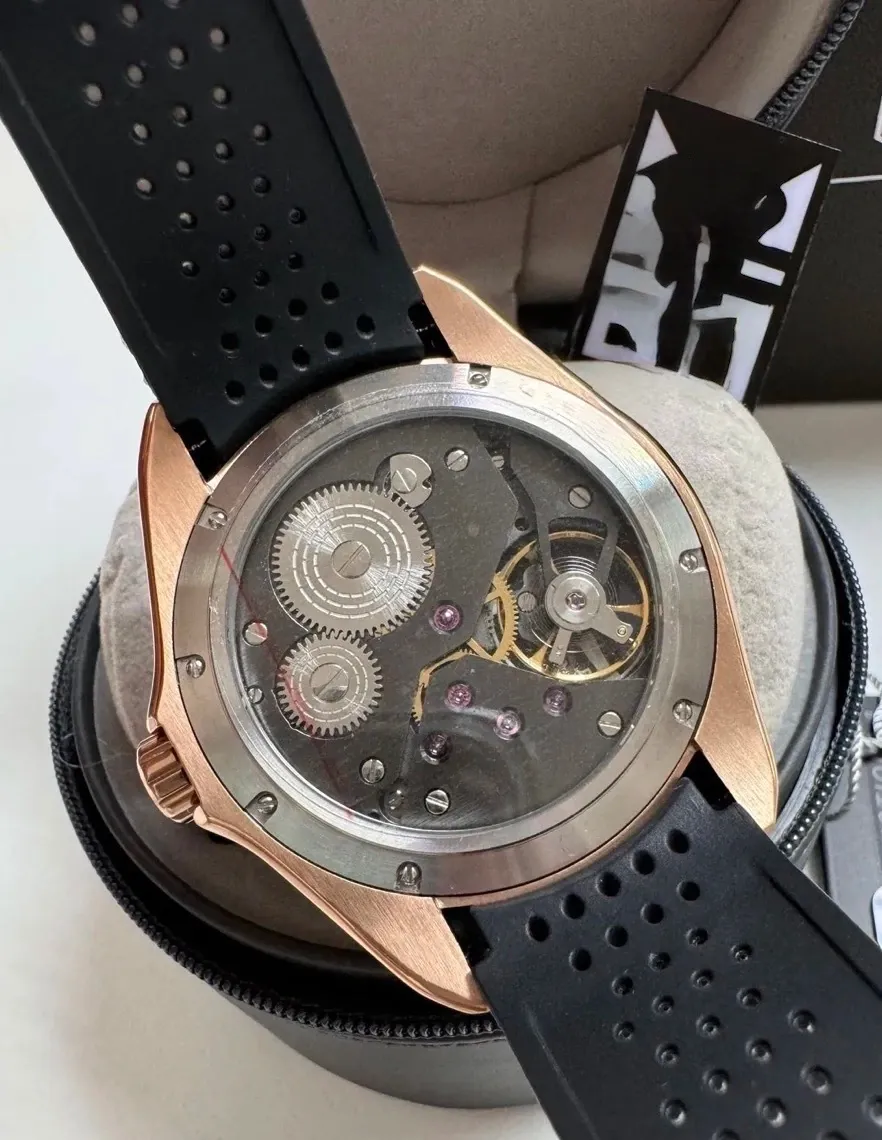 Seu diâmetro de 45 mm proporciona um visual marcante, enquanto o vidro em safira garante resistência contra riscos. A caixa em aço inoxidável denso oferece durabilidade e um acabamento sofisticado, complementado pela pulseira em silicone, que alia conforto e estilo.